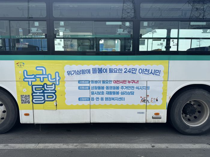 '누구나 돌봄’ 사업은 지역사회 내 돌봄이 필요한 이천시민에게 맞춤형 7대 서비스(생활돌봄, 동행돌봄, 주거안전, 일시보호, 식사지원, 재활돌봄, 심리상담)를 제공하는 사업이다. 이천시는 시내버스 홍보를 통해 시민들이 사업에 대한 정보를 더 많이 접하고 쉽게 신청할 수 있도록 편의성을 높였다. 큐알(QR)코드를 활용한 온라인 신청은 스마트폰을 이용해 광고물을 스캔하면 신청 페이지로 즉시 연결되어 복잡한 절차 없이 간편하게 서비스를 신청할 수 있다.