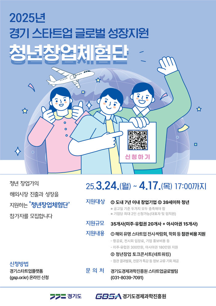 [경기뉴스탑(수원)=전순애 기자]경기도와 경기도경제과학진흥원(이하 경과원)은 청년 창업가들의 해외시장 진출과 글로벌 경쟁력 강화를 위해 다음달 17일까지 ‘청년창업체험단’ 참여기업 35개사를 모집한다.