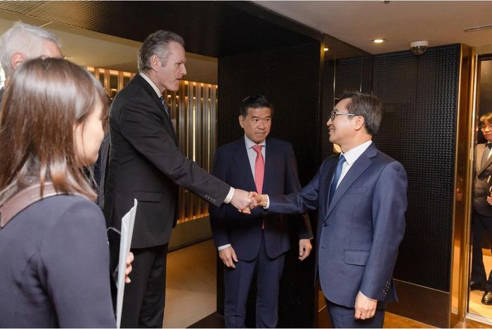 25일 오전 더플라자호텔에서 김동연 경기도지사가 마이크 던리비(Mike Dunleavy) 미국 알래스카 주지사와 인사를 하고 있다.(사진=경기도)