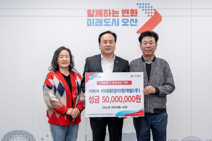 [경기뉴스탑(오산)=전순애 기자]오산시는 지난 1일 미래환경자원개발(주)(대표 김이환)으로부터 지역 내 저소득층을 위한 성금 5천만 원을 기탁받았다고 밝혔다.