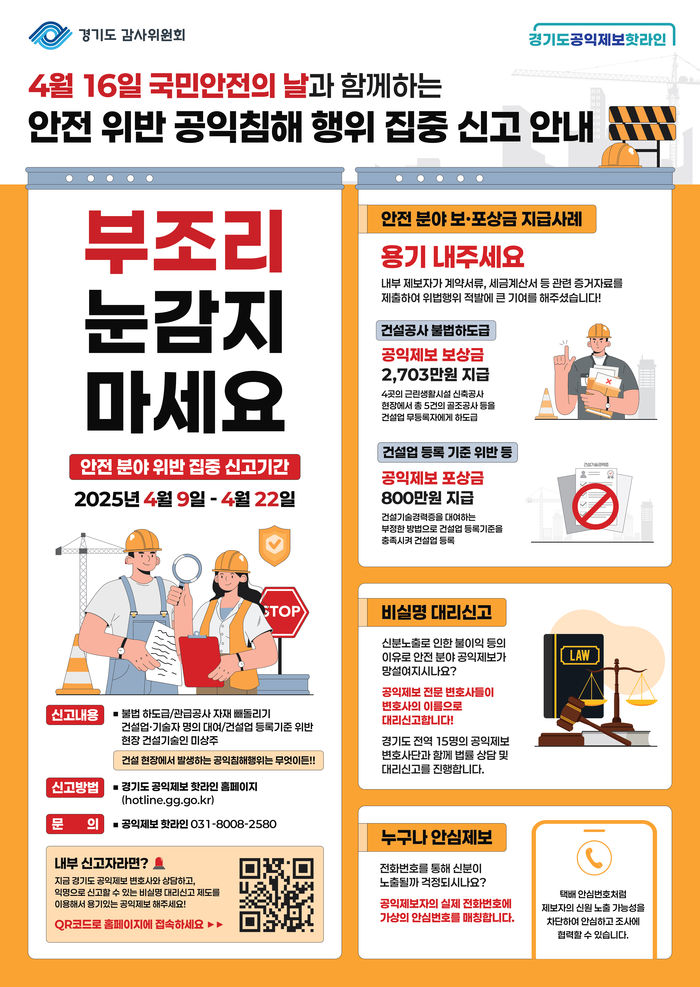 경기도 감사위원회는 해당 기간 신고를 독려할 수 있는 맞춤형 홍보도 함께 추진한다. 안전 분야 주요 공익침해 사례와 신고 방법을 담은 홍보 포스터를 경기도 주요 건설 현장에 배포하며, 건설 관련 유관기관 대상 찾아가는 간담회 개최 등 적극적으로 홍보를 진행해 도민들의 참여를 유도할 예정이다.