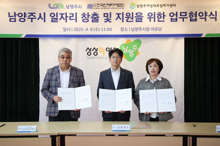 [경기뉴스탑(남양주)=이윤기 기자]남양주시는 9일, 사단법인 한국인테리어협회(회장 박남국, 이하 협회) 및 남양주여성새로일하기센터(센터장 임은희, 이하 센터)와 지역·산업 맞춤형 일자리 창출 지원사업 운영 협력을 위한 업무협약을 체결했다.