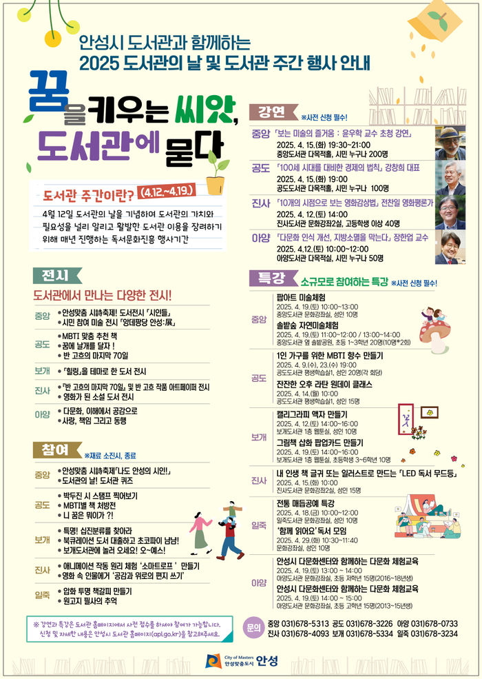 행사 신청 및 자세한 정보는 안성시 도서관 누리집(www.apl.go.kr)에서 확인할 수 있으며, 프로그램 관련 문의는 각 도서관으로 하면 된다.