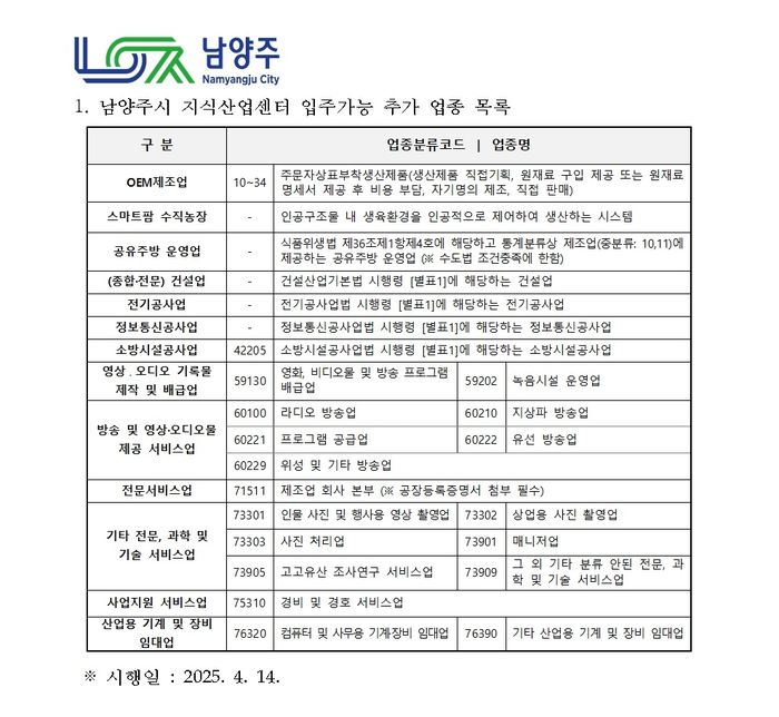 지식산업센터 입주가능 업종 추가 고시(사진=남양주시)
