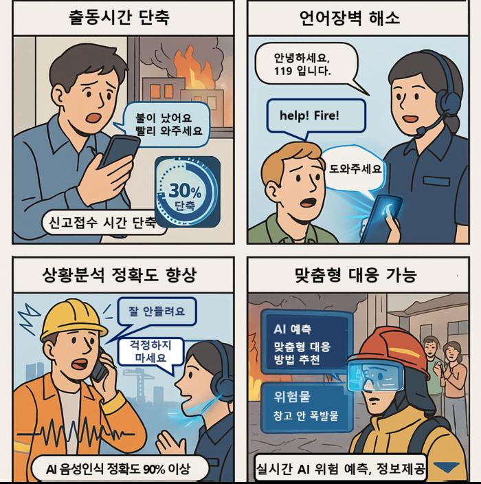 안전 분야 과제인 ‘AI 기반 119 신고접수 시스템’은 재난 발생 시 신고 내용을 즉각 문자로 변환하고 핵심 정보를 자동 추출하는 기술이다. ‘음성인식 기반의 119 신고접수 시스템 구축’을 통해 반복적인 질문 없이 신속하게 상황을 파악함으로써 재난 신고부터 출동 지령까지의 골든타임을 확보하는 것이 목표다.