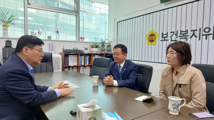 [경기뉴스탑(수원)=장동근 기자]경기도의회 보건복지위원회 이선구 위원장(더불어민주당, 부천2)은 4월 17일 위원장실에서 이용빈 경기복지재단 대표이사와 임숙자 기획조정실장의 예방을 받고, 보건복지 분야 정책역량 강화를 위한 정담회를 가졌다.