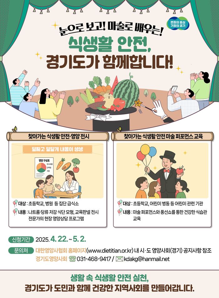 [경기뉴스탑(수원)=장동근 기자]경기도가 사단법인 대한영양사협회 경기도영양사회와 함께 도민의 건강한 식생활 문화 확산을 위한 ‘찾아가는 식생활 안전‧영양전시’와 ‘식생활 안전 마술 퍼포먼스 교육’ 프로그램 신청을 5월 2일까지 접수한다.
