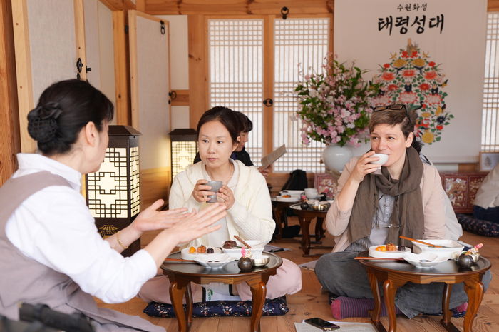 수원 화성행궁 별주에서 열리는 세계유산 활용 프로그램 ‘수원화성 태평성대’ 참가자들이 혜경궁 궁중 다과 체험을 하고 있다.(사진=수원시)