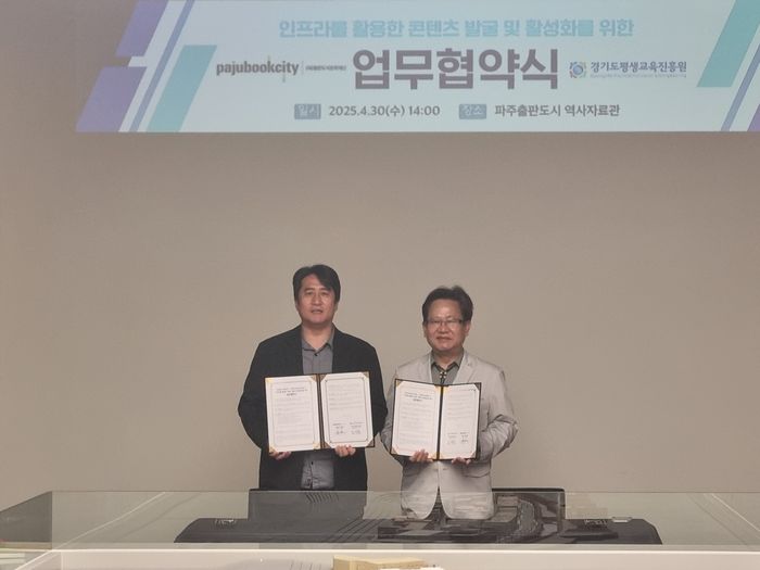 [경기뉴스탑(파주)=이윤기 기자]경기도평생교육진흥원 경기미래교육파주캠퍼스는 30일 파주시 아시아출판문화정보센터에서 출판도시문화재단과 경기 북부 교육·문화 콘텐츠 개발을 위한 업무협약을 체결했다.