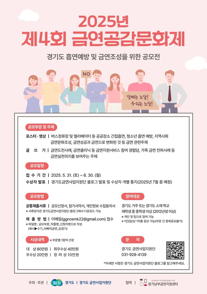 자세한 사항은 경기도금연사업지원단 누리집(blog.naver.com/ggnosmk)에서 확인할 수 있으며, 문의 사항은 경기도금연사업지원단(031-928-4139)을 통해 안내받을 수 있다.