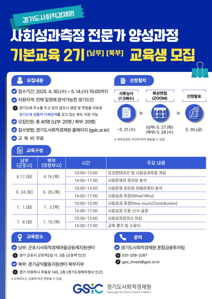 [경기뉴스탑(수원)=장동근 기자]경기도사회적경제원은 14일까지 ‘사회성과측정 전문가 양성과정 기본교육 2기’ 교육생 40명을 모집한다.