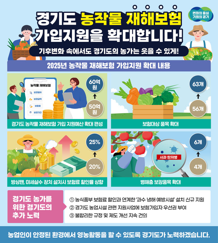 지난해 11월 기록적인 폭설 등 기후변화로 인한 자연재해 발생 빈도가 증가한 데 따른 조치로 도는 올해 보험 가입을 희망하는 모든 농가가 가입할 수 있도록 경기도 농작물재해보험 가입 지원 예산을 전년 대비 10억 원 증액해 60억 원으로 확대 편성했다.