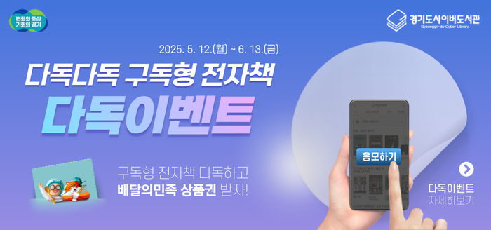 행사 대상은 경기도사이버도서관 구독형 전자책 서비스를 이용하는 도민이다. 도는 5월 12일부터 6월 13일까지 한 달간 대출 권수 상위 100명을 선정해 5천 원 상당의 모바일 쿠폰을 제공할 계획이다.
