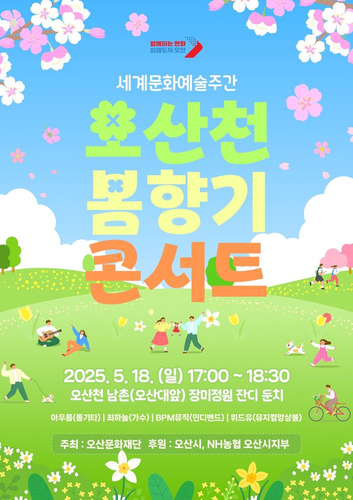 시는 이러한 오산천의 가치를 시민들과 공유하기 위해 다양한 문화·참여 프로그램을 마련했다. 오는 18일에는 남촌 장미정원 잔디둔치에서 '봄향기 콘서트'가 열린다. 자연 속에서 음악을 즐길 수 있도록 총 4팀의 공연이 예정돼 있으며, 시민들이 함께 문화와 소통을 나누는 자리가 될 전망이다.