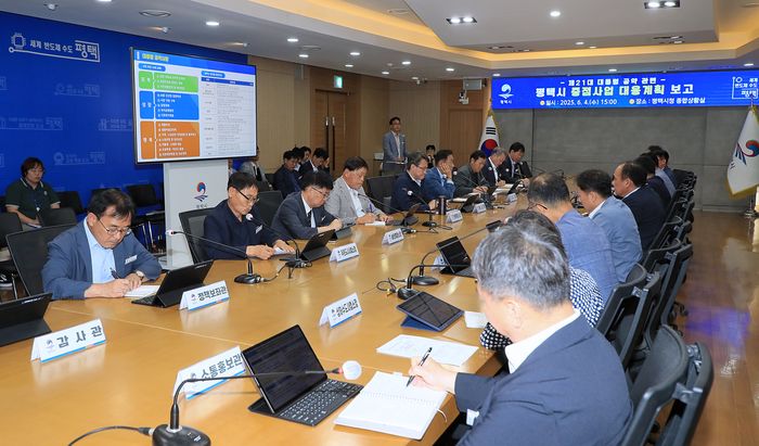 [경기뉴스탑(평택)=전순애 기자]평택시가 제21대 대통령 국정과제에 발맞춘 지역 전략사업 추진에 속도를 낸다. 시는 4일 종합상황실에서 ‘제21대 대통령 공약 관련 평택시 중점사업 대응계획 보고회’를 열고, 국정과제와 연계 가능한 25개 주요 사업에 대한 분야별 대응 전략을 점검했다.