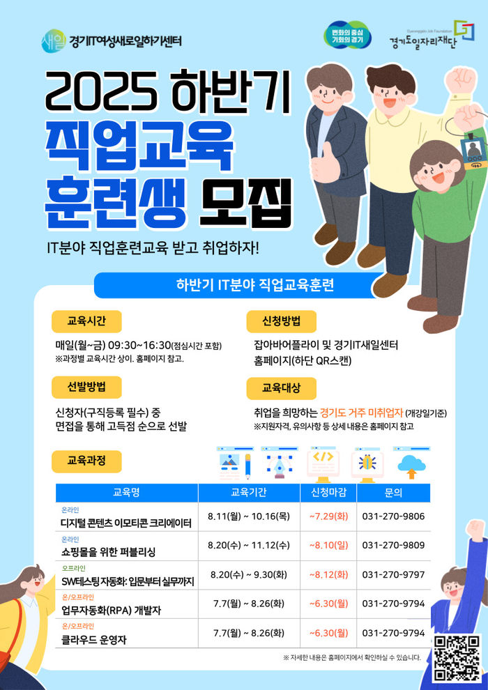 [경기뉴스탑(수원)=장동근 기자]경기도일자리재단 경기IT새일센터는 IT분야 취업을 준비하는 도민을 대상으로 ‘2025년 하반기 직업교육훈련’ 참여자를 모집한다.