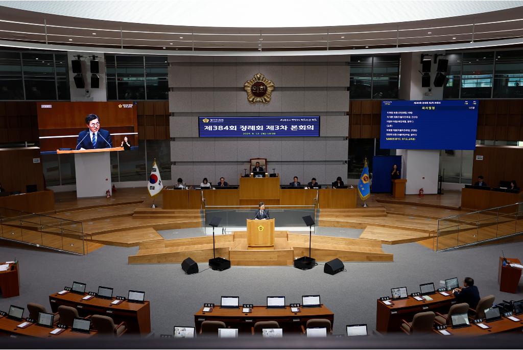 운데 제384회 정례회 3차 본회의가 열리고 있다.