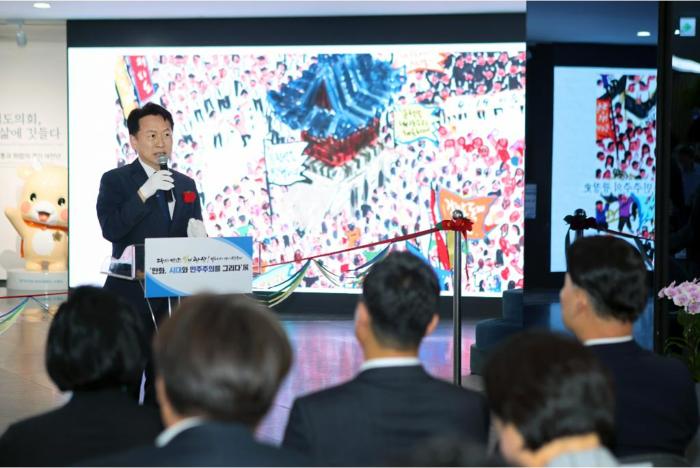 10일 오후 경기도의회 1층 로비에서 열린 ‘만화, 시대와 민주주의를 그리다’展 개막식에서 고영인 경제부지사가 축사를 하고 있다.