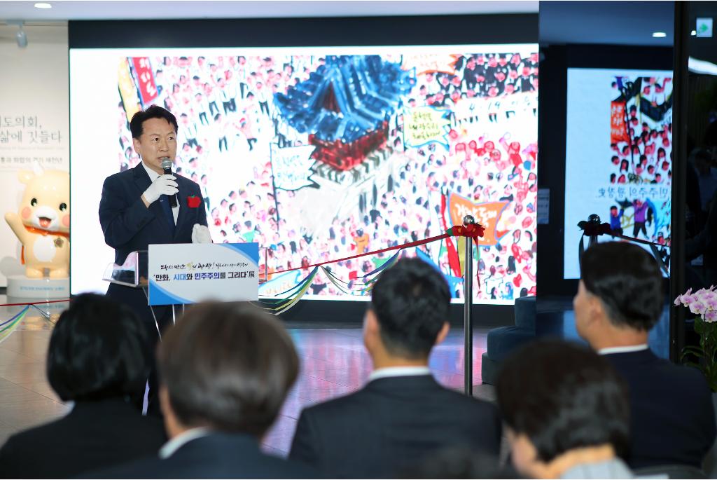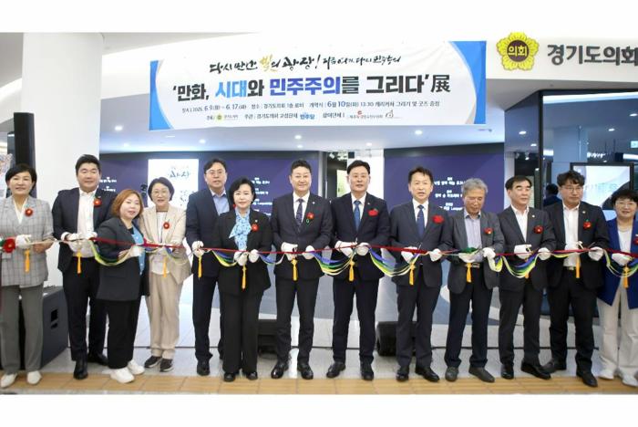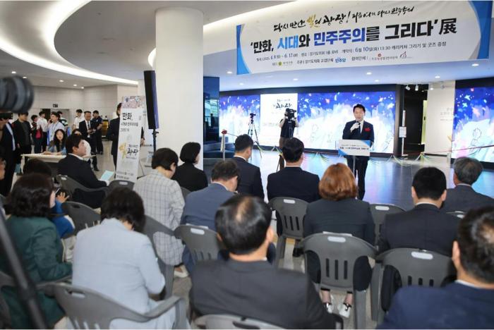 [경기뉴스탑(수원)=장동근 기자]10일 오후 경기도의회 1층 로비에서 고영인 경제부지사와 김진경 의장, 정윤경 부의장, 더민주 대표단, 도의원 등이 참석한 가운데 ‘만화, 시대와 민주주의를 그리다’展 개막식이 열렸다.