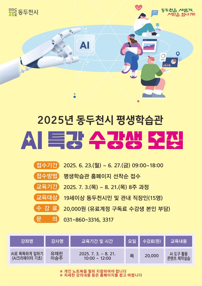 수강 신청은 6월 23일(월)부터 6월 27일(금)까지 평생학습관 홈페이지를 통해 선착순으로 진행되며, 모집 인원은 총 15명이다. 신청 대상은 19세 이상 동두천 시민 또는 관내 직장 재직자이며, 수업 참여 시 개인 노트북을 지참해야 한다.
