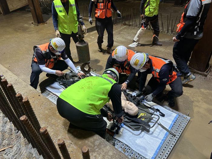 훈련은 실질적인 사고 발생 상황을 가정한 시나리오 기반의 대응훈련으로 구성됐으며, 각 공구의 시공 상황에 따른 맞춤형 안전대책이 집중적으로 점검됐다. 1공구에서는 전력설비 인근 작업을 반영해 절연도구를 활용한 감전사고 예방 조치를 훈련했고, 2공구에서는 터널 굴착 중 단면 변형이 발생한 상황을 가정하여 H-BEAM(H 형강) 등 가시설 부재를 활용한 구조물 보강 절차를 검토했다. 3공구는 시스템 동바리 설치 중 발생할 수 있는 고소작업 추락사고를 중심으로, 작업자 구조 및 응급대응 체계를 점검했다.