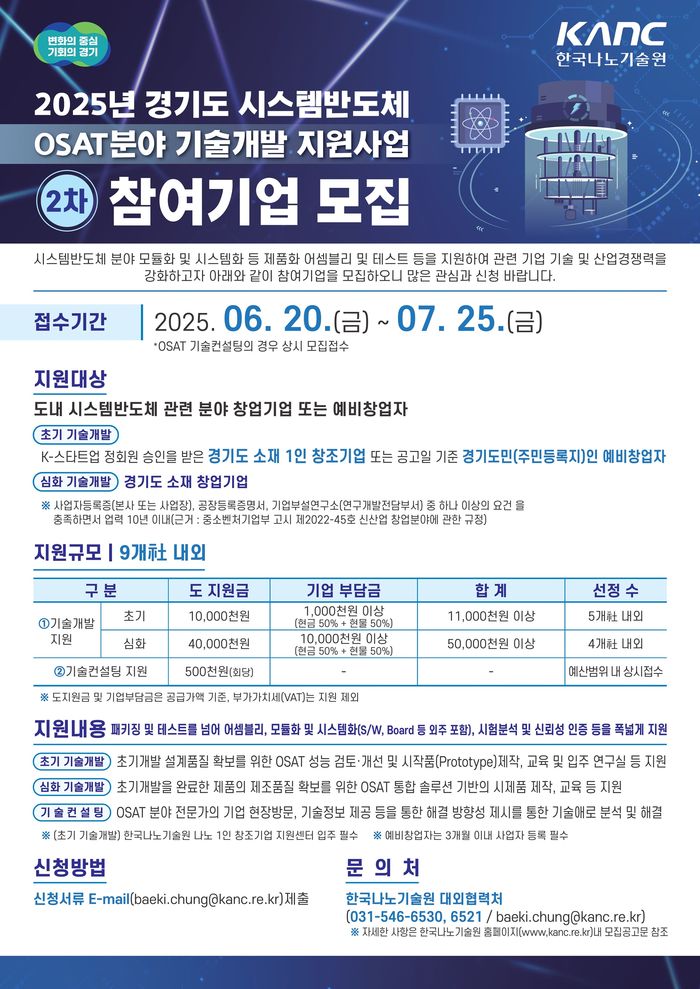 [경기뉴스탑(수원)=전순애 기자]경기도가 시스템반도체 산업 생태계 강화 지원을 위해 ‘2025년도 경기도 시스템반도체 후공정(OSAT)분야 기술개발 지원사업’에 참여할 도내 창업 기업을 7월 25일까지 모집한다.