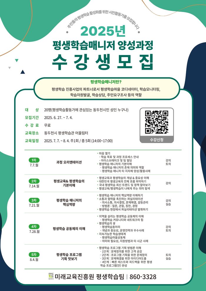 한편, 평생학습 매니저 양성과정은 7월 7일부터 8월 4일까지 5차시(15시간)로 진행되며, 무료로 제공된다. 동두천시에 거주하는 성인이면 누구나 신청할 수 있으며, 신청은 네이버 폼(QR 코드 접속)을 통해 선착순으로 접수한다. 자세한 사항은 미래교육진흥원 평생학습팀(031-860-3328)으로 문의하면 된다.
