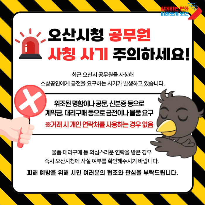 [경기뉴스탑(오산)=전순애 기자]오산시는 최근 오산시 공무원을 사칭해 소상공인에게 금품을 요구하는 사기 범죄가 발생함에 따라 시민들에게 각별한 주의를 당부했다.