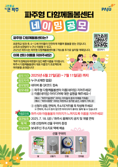 [경기뉴스탑(파주)=이윤기 기자]파주시가 오는 8월로 예정된 '파주형다함께돌봄센터' 1호점 개소를 앞두고, 27일부터 7월 11일까지 전국민을 대상으로 '파주형다함께돌봄센터 네이밍 공모전'을 개최한다.