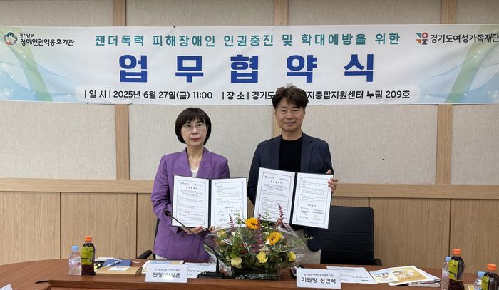 [경기뉴스탑(수원)=장동근 기자]경기도여성가족재단 내 젠더폭력통합대응단(이하 대응단)은 지난 27일 경기남부장애인권익옹호기관과 장애인 대상 젠더폭력 피해 지원 및 인권침해 예방을 위한 업무협약을 체결했다.