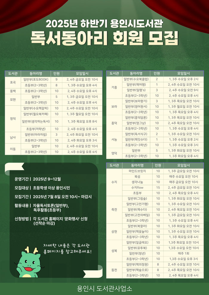 독서동아리는 동부도서관 산하 6개 도서관(포곡·동백·모현·청덕·남사·이동) 중부도서관 산하 5개 도서관(기흥·보라·흥덕·서농·영덕) 서부도서관 산하 5개 도서관(수지·죽전·상현·성복·동천) 등 총 16개 도서관에서 운영된다.