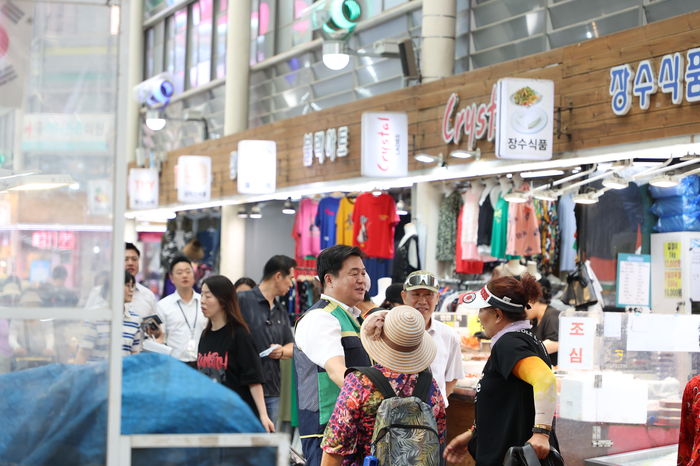 임병택 시흥시장이 10일 삼미시장을 찾아 폭염상황을 점검하고 상인들과 소통하고 있다 (사진=시흥시)