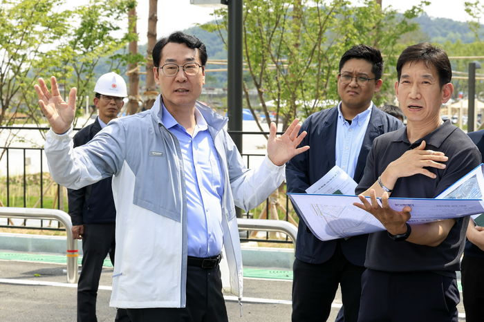 정명근 화성특례시장이 동탄패밀리풀 문화공원 현장을 점검하고 있다.(사진=화성시)