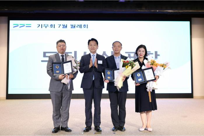 18일 오전 경기도경제과학진흥원에서 열린 7월 기우회에서 고영인 경제부지사가 표창장 수여자들과 기념촬영을 하고 있다.