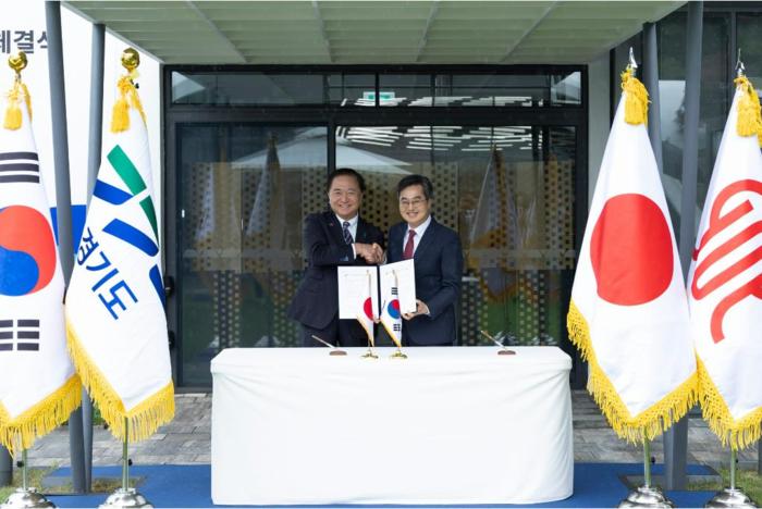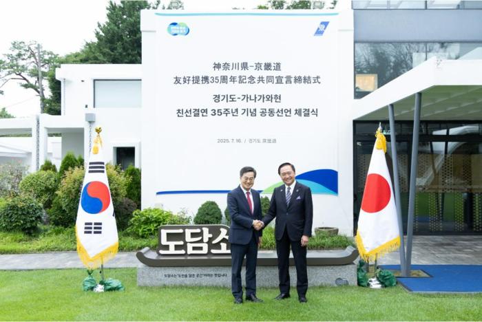 [경기뉴스탑(수원)=장동근 기자]16일 오전 도담소에서 김동연 경기도지사가 구로이와 유지 가나가와현 지사 및 대표단과 도-가나가와현 35주년 기념 협력 심화 및 공동선언 체결식을 하였다.(사진=경기도)