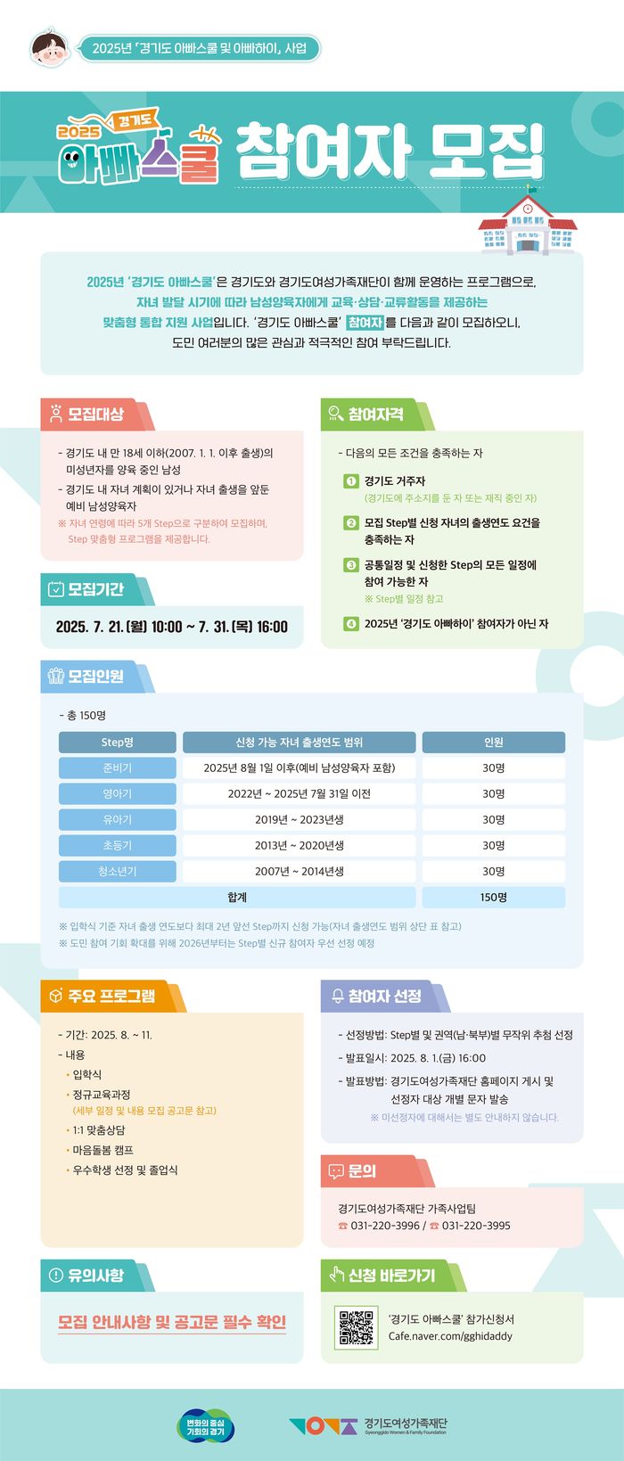 [경기뉴스탑(수원)=장동근 기자]경기도여성가족재단이 도내 남성양육자의 양육 역량 강화를 위해 21일부터 31일까지 ‘경기도 아빠스쿨’ 참여자를 모집한다.