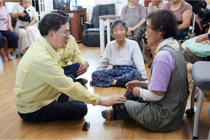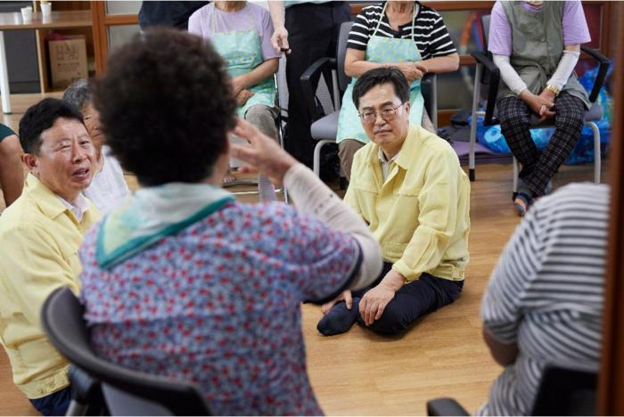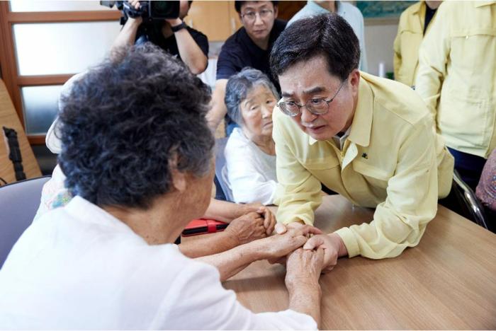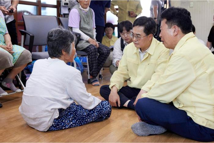 22일 오후 가평군 조종면 신상리에 김동연 경기도지사가 집중호우로 인한 이재민 대피소 방문해 이재민 위로를 하고 있다.