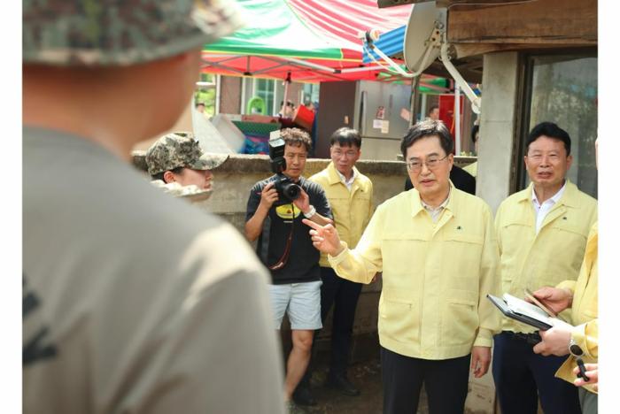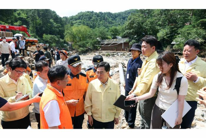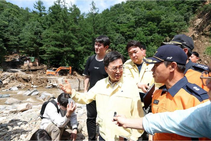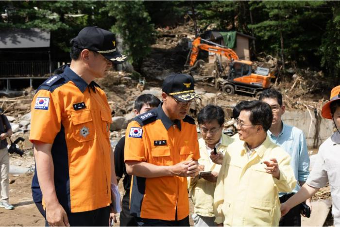 22일 오후 김동연 경기도지사가 가평군 조종면 집중호우 피해지역 현장을 방문하여 수색구조 당부 및 직원 격려를 하고 있다.