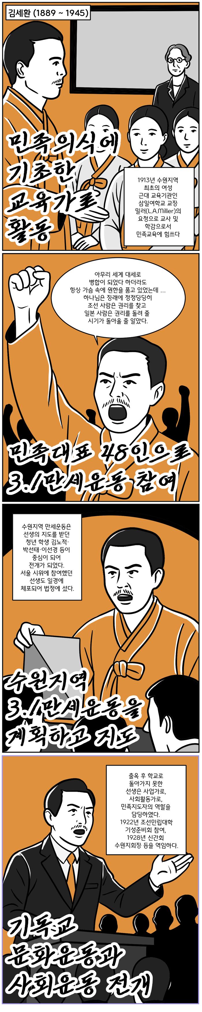 김세환 독립운동가는 수원 출신으로, 삼일학교와 수원상업학교를 설립해 후진교육에 전념하며 독립운동을 전개했다. 민족대표 48인으로 3·1운동을 주도하다 일경에 체포됐으며, 신간회 수원지회장과 수원체육회장을 역임하며 수원 지역을 대표하는 지도자로 활동했다.