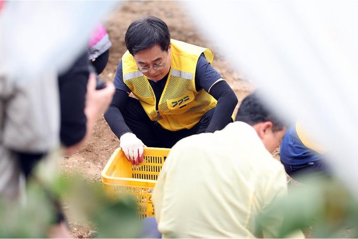 김 지사는 토사를 자루에 담아 밭 외부로 옮기고, 자원봉사자들과 함께 천막의 비닐을 제거하는 한편, 봉사자들이 더위에 지치지 않도록 쉼터 버스와 커피차 이용을 안내했다.