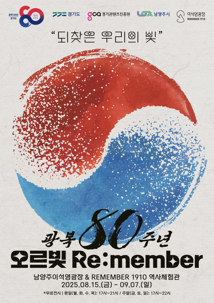 [경기뉴스탑(남양주)=이윤기 기자]경기도가 광복 80주년을 맞아 잃어버렸던 빛을 되찾은 역사적 순간을 최첨단 문화기술 콘텐츠로 재조명하고자 8월 15일 광복절부터 9월 7일까지 남양주시 이석영광장과 리멤버(REMEMBER)1910 역사체험관 일대에서 문화기술 콘텐츠 전시 브랜드 ‘오르:빛’의 네 번째 체험형 전시 ‘오르빛 리멤버(Re:member)’를 개최한다.