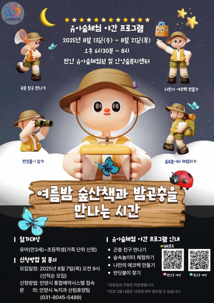 최대호 안양시장은 “작은 곤충 하나에도 설레는 여름밤, 숲은 아이들에게 가장 순수한 교실이 되어줄 것”이라며 “이번 프로그램을 통해 아이들이 자연을 보다 친근하게 느끼고, 생태에 대한 흥미를 키울 수 있기를 바란다”고 말했다.