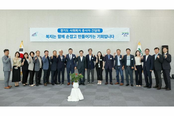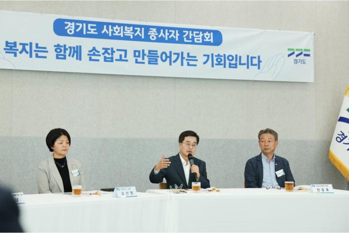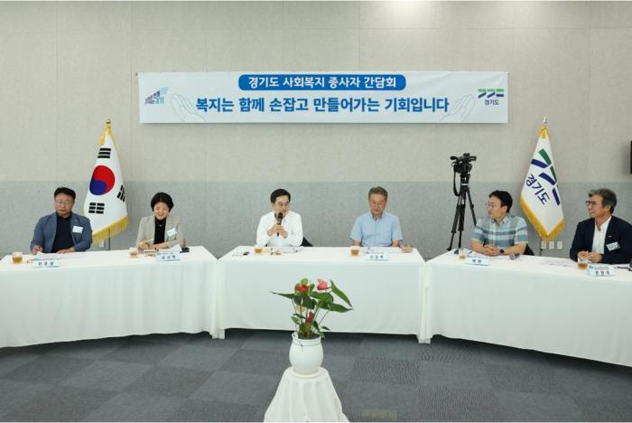 [경기뉴스탑(수원)=장동근 기자]8일 오전 경기도청 단원홀에서 김동연 경기도지사와 박찬수 경기도사회복지사협회장, 나윤채 한국장기요양기관지역협회연합회장 등 20여 명이 사회복지 종사자의 현장 목소리 청취 및 개선방안 모색을 위한 경기도 사회복지 종사자 간담회가 열렸다.