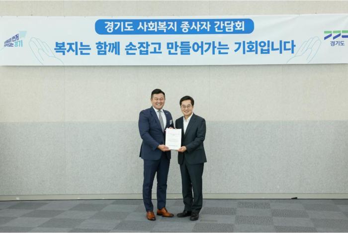 8일 오전 경기도 단원홀에서 김동연 경기도지사에게 박찬수 경기도사회복지사협회장가 사회복지종사자 처우개선비 인상 및 지원대상 확대 관련 서명부 전달하고 있다.