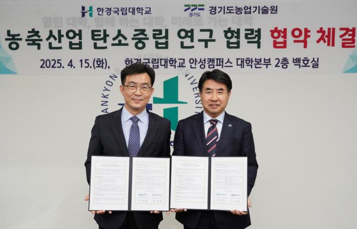 경기도농업기술원이 지난 4월 15일, 도내 유일한 국립대학인 한경국립대학교와 ‘농업분야 탄소중립 연구협력을 위한 업무협약’을 체결했다.(사진=경기도)
