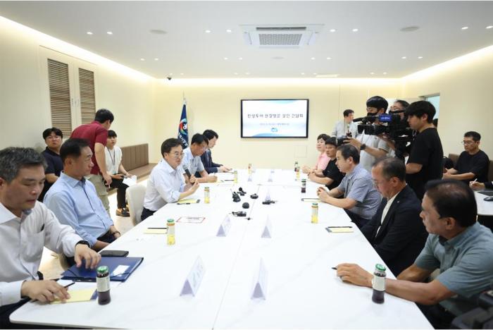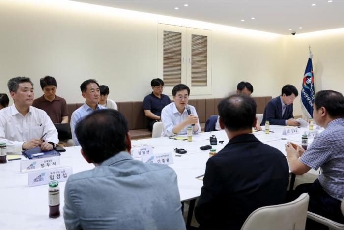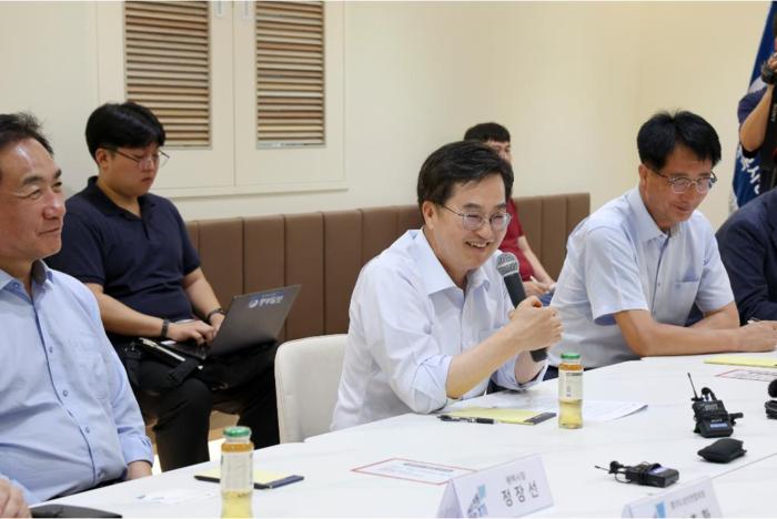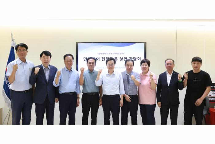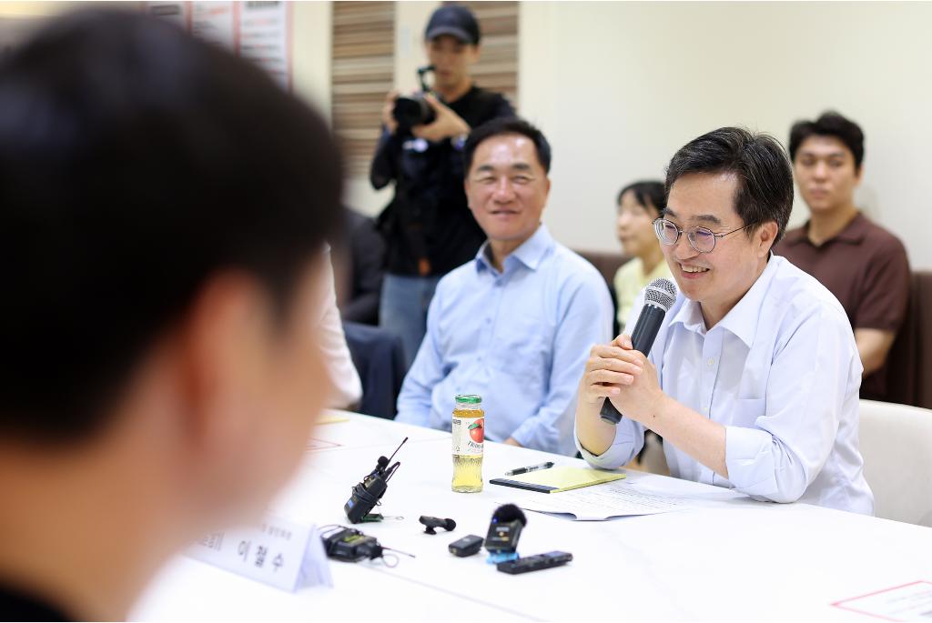20일 오후 평택 통복시장을 방문한 김동연 경기도지사가 상인들과 간담회를 하고 있다.