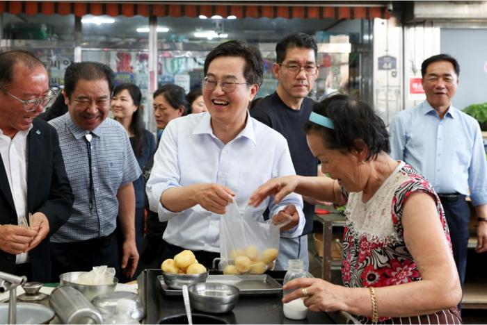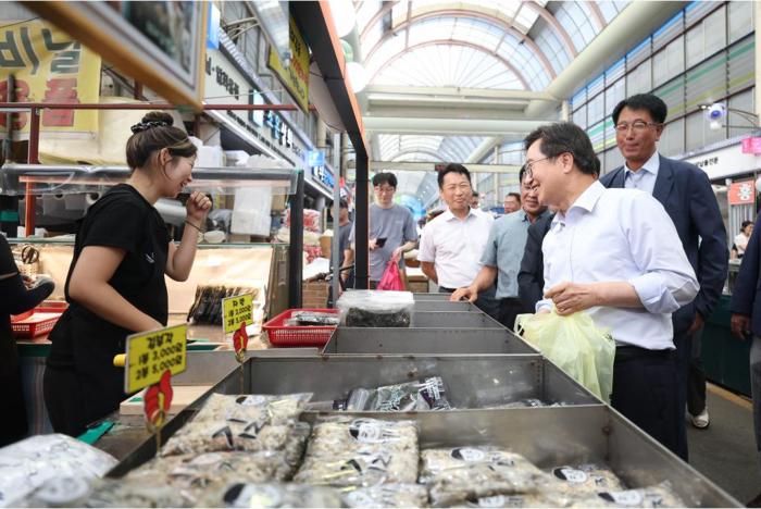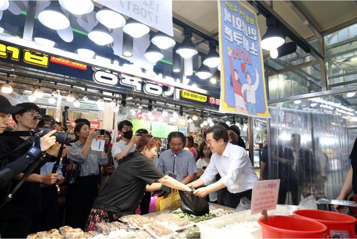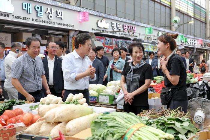 [경기뉴스탑(평택)=전순애 기자]20일 오후 김동연 경기도지사가 평택 통복시장을 방문해 민생회복 소비쿠폰 사용 현황, 물가 점검 및 상인 격려 등을 했다.(사진=경기도)