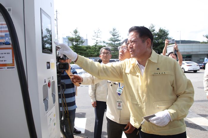 이날 최 시장은 전기버스를 직접 충전해보고, 충전기 작동 상태, 충전 효율, 전력 공급 상황 등을 확인했다. 또 인공지능 감시카메라의 모니터링 상황도 꼼꼼하게 점검했다.