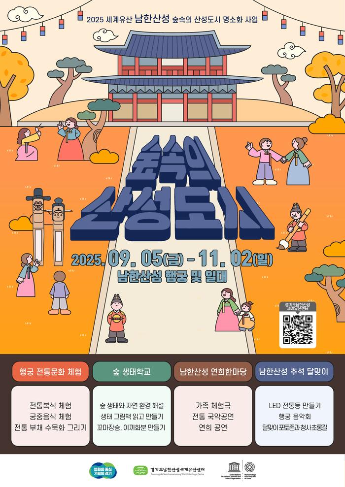 [경기뉴스탑(하남)=박찬분 기자]경기도가 가을을 앞두고 남한산하남)=성을 찾는 방문객을 위해 9월 5일부터 11월 2일까지 추석을 포함한 매주 금요일, 주말과 휴일에 ‘2025년 세계유산 남한산성 – 숲속의 산성도시 명소화’ 프로그램을 진행한다.