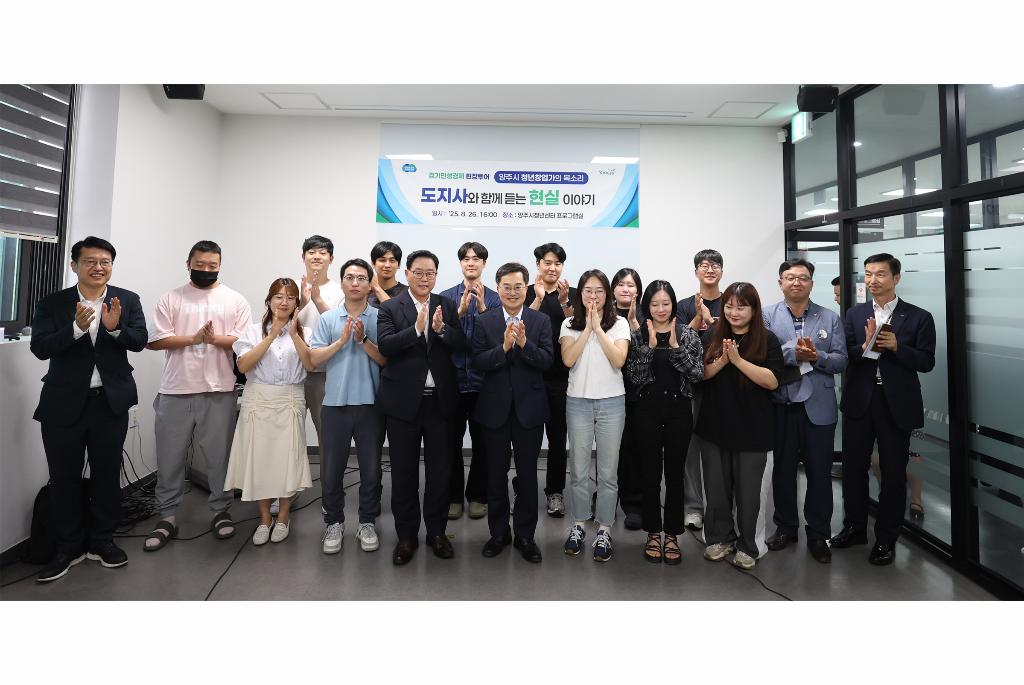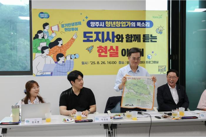 [경기뉴스탑(야주)=이윤기 기자]26일 오후 양주 청년센터에서 김동연 경기도지사, 강수현 양주시장 및 청년창업자 12명이 참석한 가운데 양주시 청년센터 청년 창업자 간담회가 열렸다.